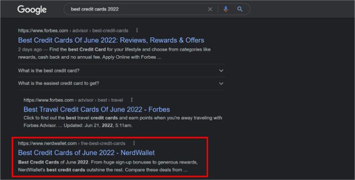 Nerdwallet, an affiliate website, reviews and recommends financial products. As shown above, one of their blog posts ranks in the search engine results page (SERP) for “best credit cards 2022.”.