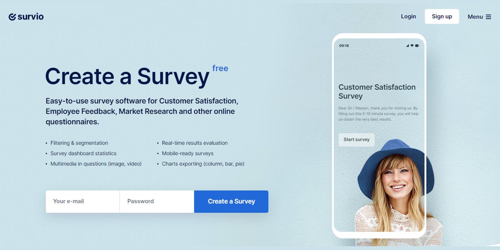 Survio is an easy-to-use software for creating surveys, collecting feedback, and analyzing and sharing data. It has a free version and offers a free trial for the priced versions. It has a user-friendly, clear, intuitive, and easy-to-navigate dashboard that provides you with a lot of options and question models.